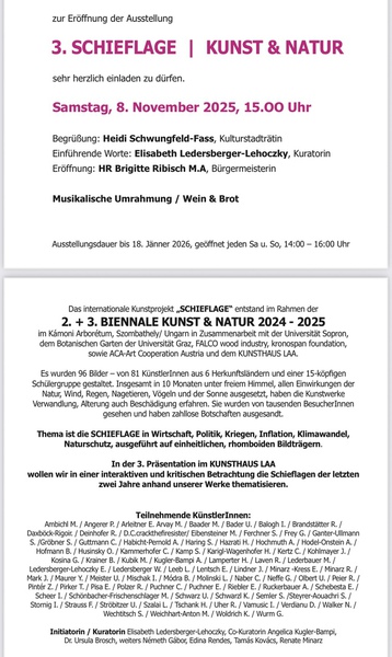 Die Internationale Biennale Skulpturenausstellung "Straight to nature" und die Freiluftgalerie auf Zeit "Schieflage" finden im Botanischen Garten der Universität Graz, 8010 Graz, Schubertstrasse 59 statt.